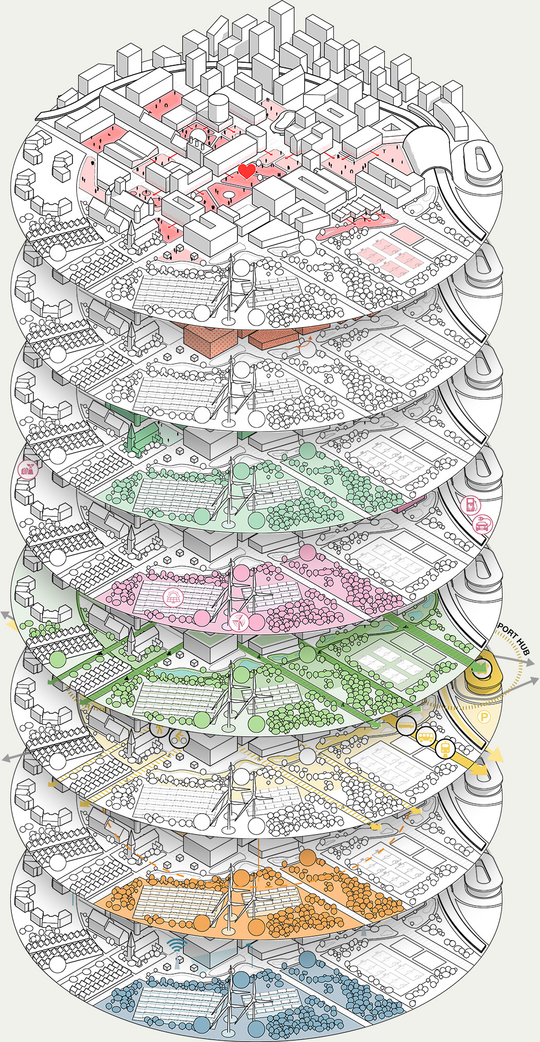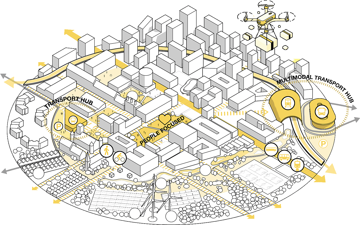 - Limiting vehicles in the heart of the estates while establishing perimeter mobility hubs to facilitate seamless transitions between various transport modes.