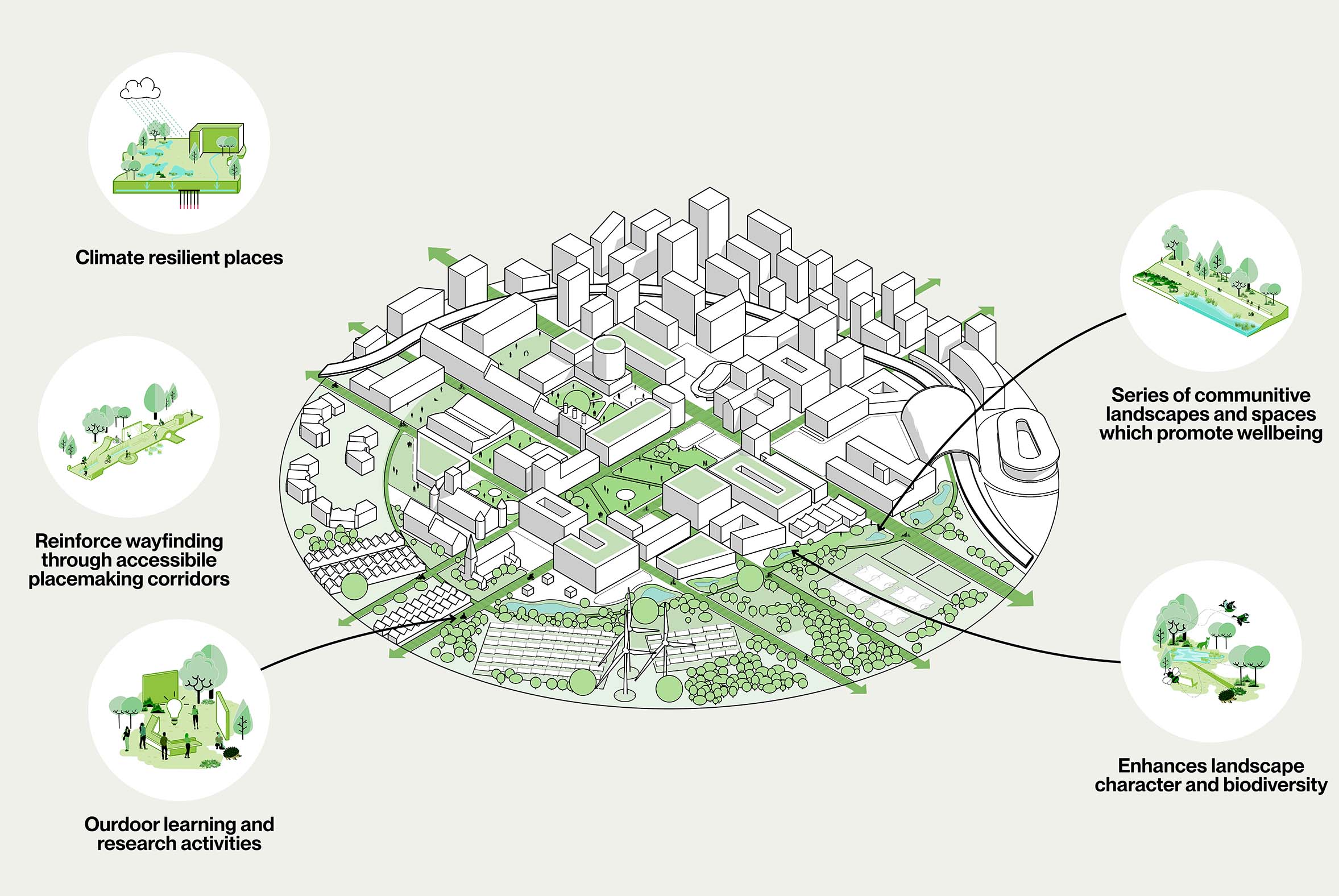 - Create commonality between greenspaces through a coherent and sustainable palette; a cohesive typology of planting and sustainable paving materials which support wayfinding and enhance biodiversity.