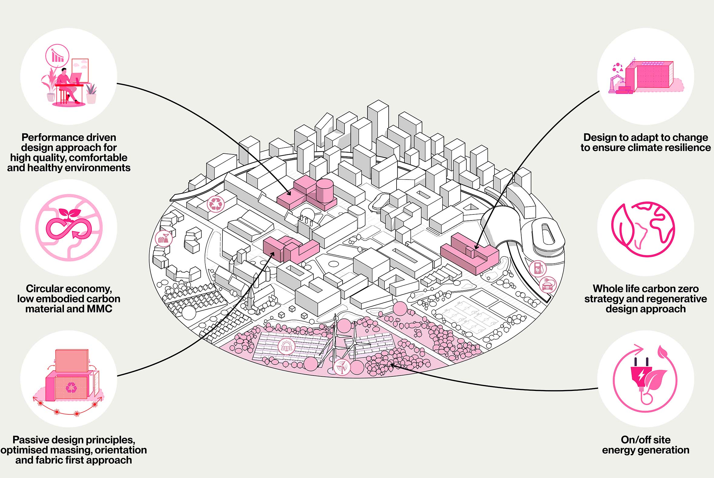 Regenerative, climate positive, high quality and inspiring buildings with whole life thinking approach, considering carbon, impact and cost.