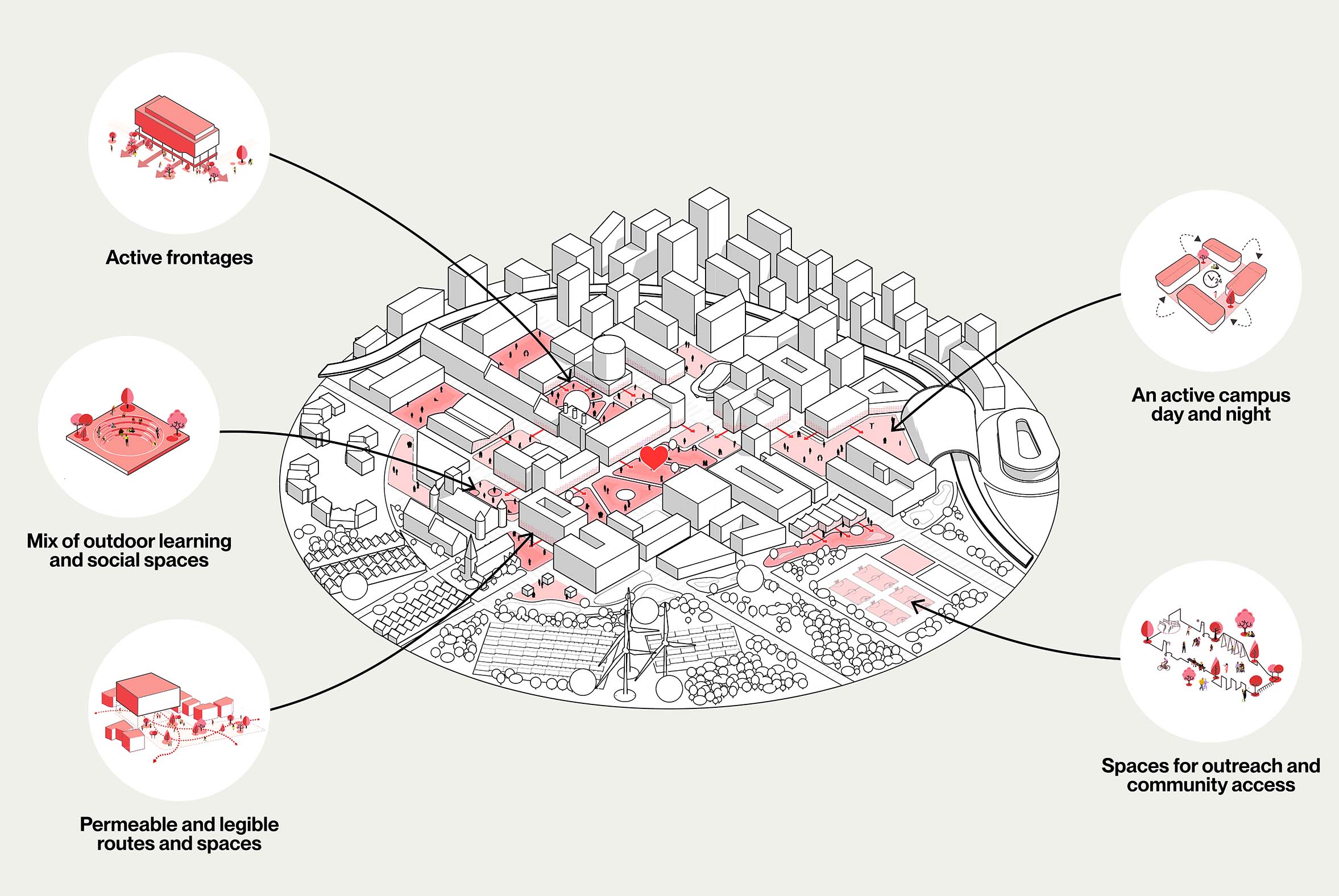 Coherent external spaces, permeable buildings with shared social activities on the lower levels, offering opportunities for a range of formal and informal gatherings and a vibrant mix of uses, to create an active and engaging environment throughout the day.