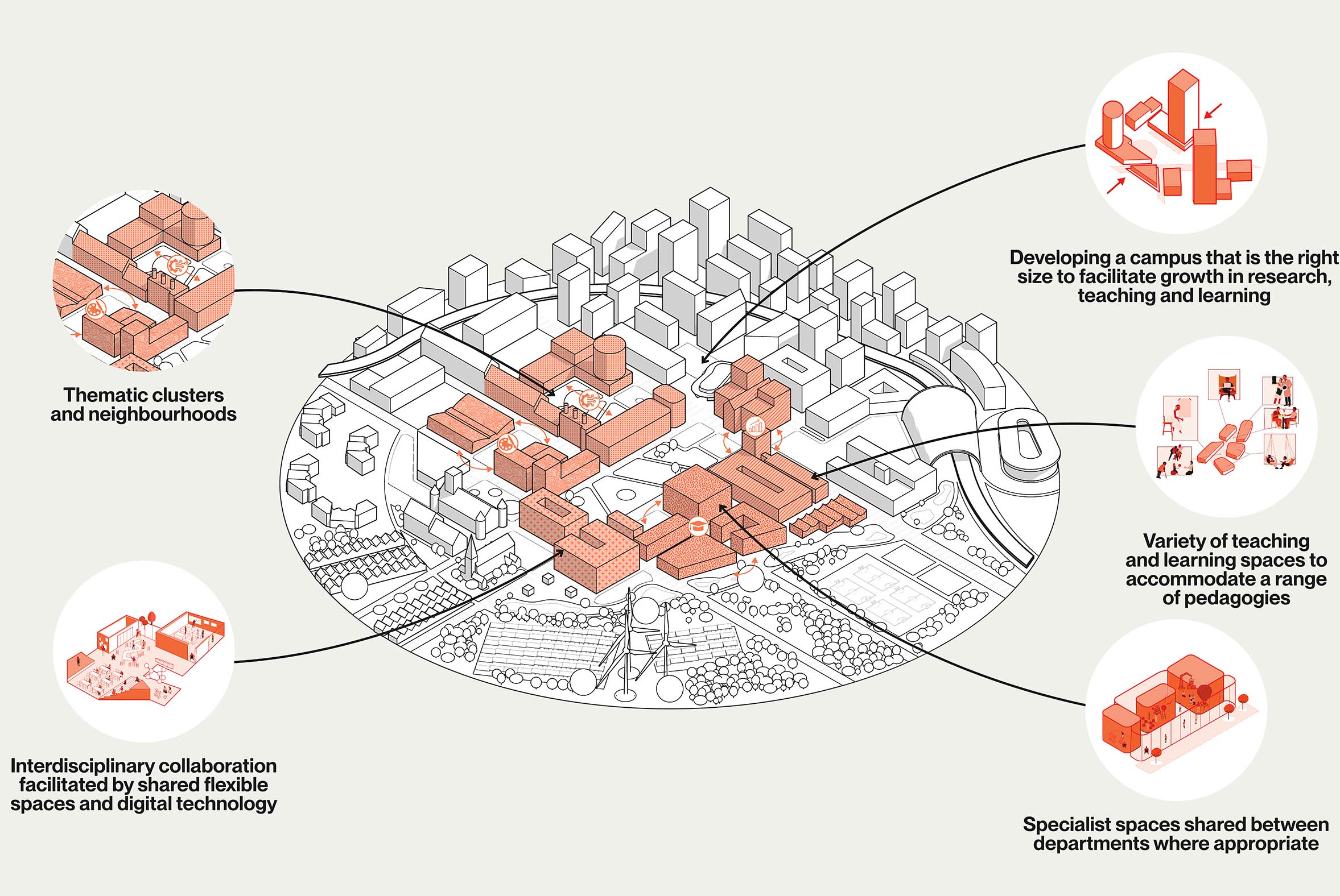 - Spaces organised into thematic or functional clusters to encourage sharing and promote inter-disciplinary or cross-departmental collaboration.